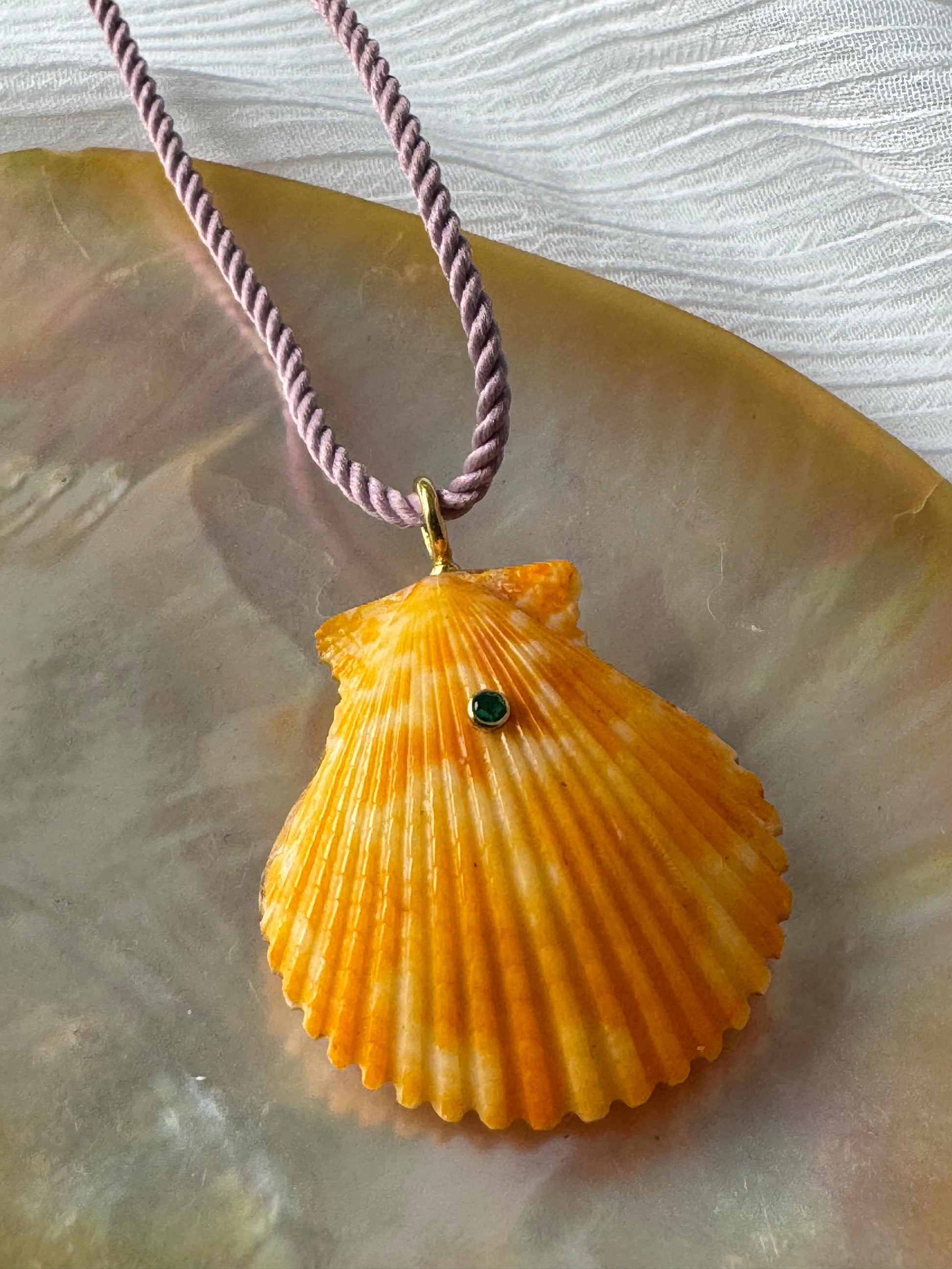 Crafted from all-natural materials, this handcarved necklace imitates the iconic shape of a sunrise shell. Its dual-sided design allows for the wearer to showcase either material, highlighting the texture and distinctive qualities of each shell. Featuring a precious stone, this necklace exudes an air of sophistication, making it a truly one-of-a-kind piece.