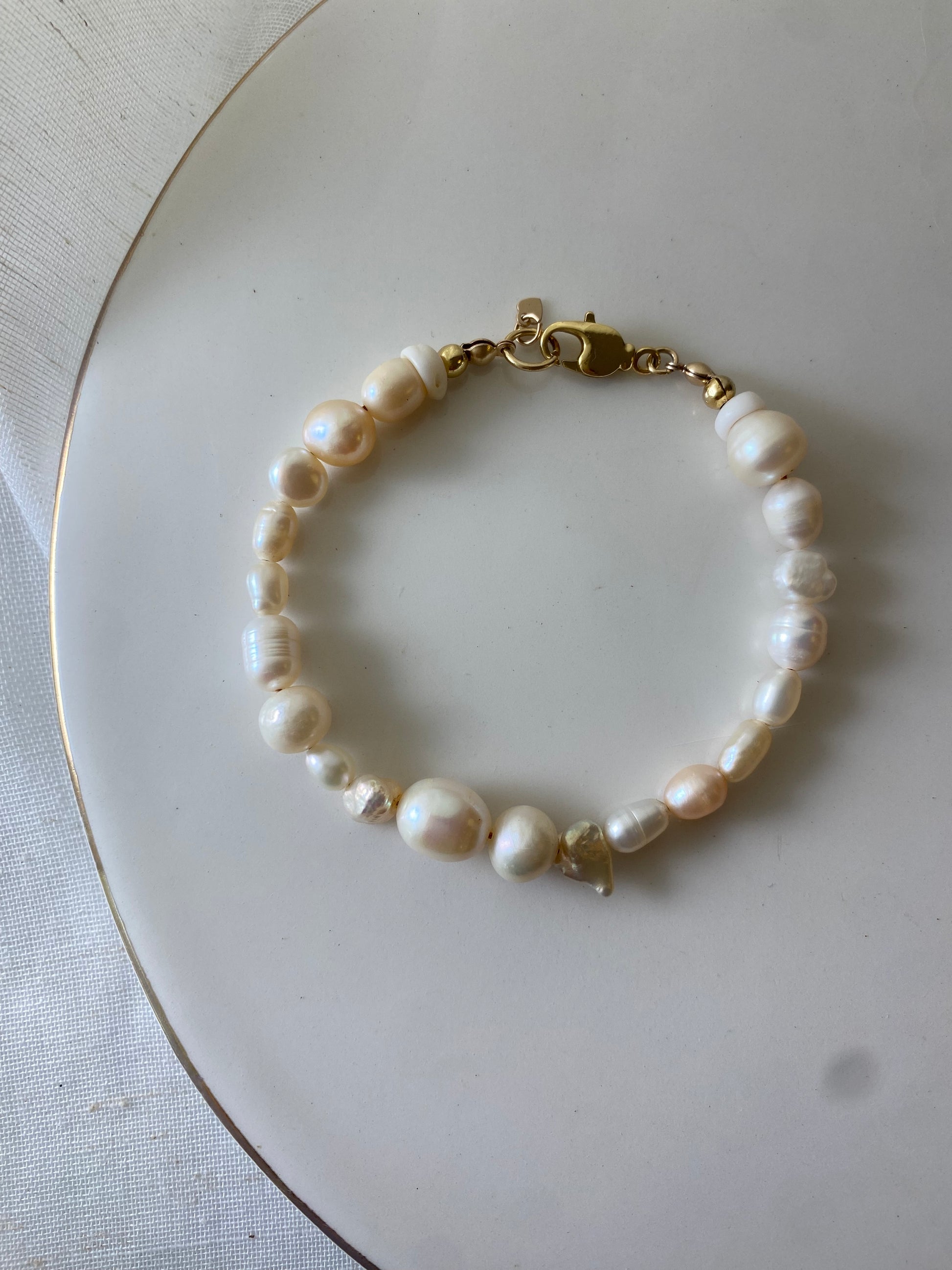 Reminiscent of ocean foam, puka shells, ivory and creamy white pearls in various shapes give this bracelet a feminine texture.